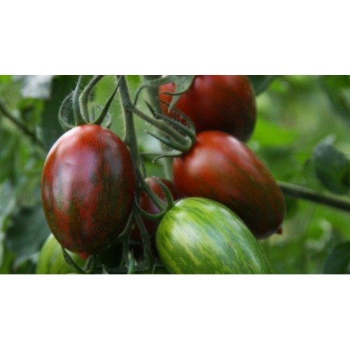 Frugt: Mahognifarvet tomat med grønne striber og lille spids. 6 x 3,5 cm. Godt udbytte.